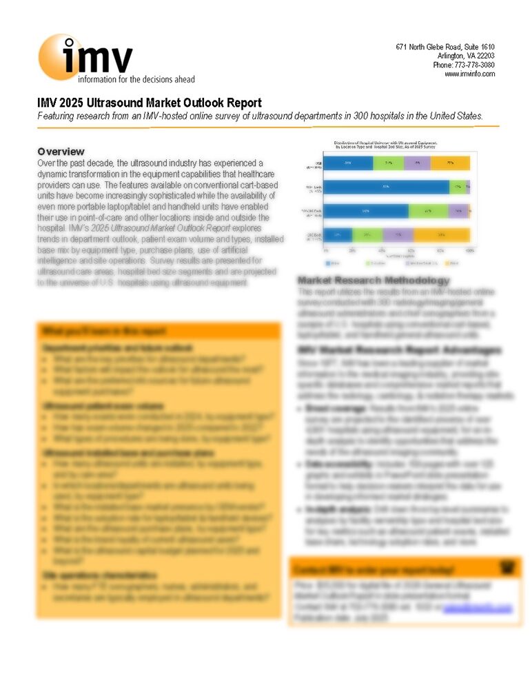 Nearly half of the 300 healthcare providers surveyed in IMV's 2025 Ultrasound Market Outlook Report reported increased procedure volumes. Discover critical insights into equipment trends across conventional cart-based, laptop/tablet, and handheld ultrasound systems, revealing purchase plans, installed base dynamics, and operational characteristics that are reshaping diagnostic imaging departments. This comprehensive analysis of U.S. hospital ultrasound usage provides the strategic intelligence healthcare leaders and equipment manufacturers need to capitalize on emerging opportunities in this market. Based on extensive survey data projected across the U.S. hospital landscape, this report is essential for understanding where the ultrasound industry is headed and how to position your organization for success.